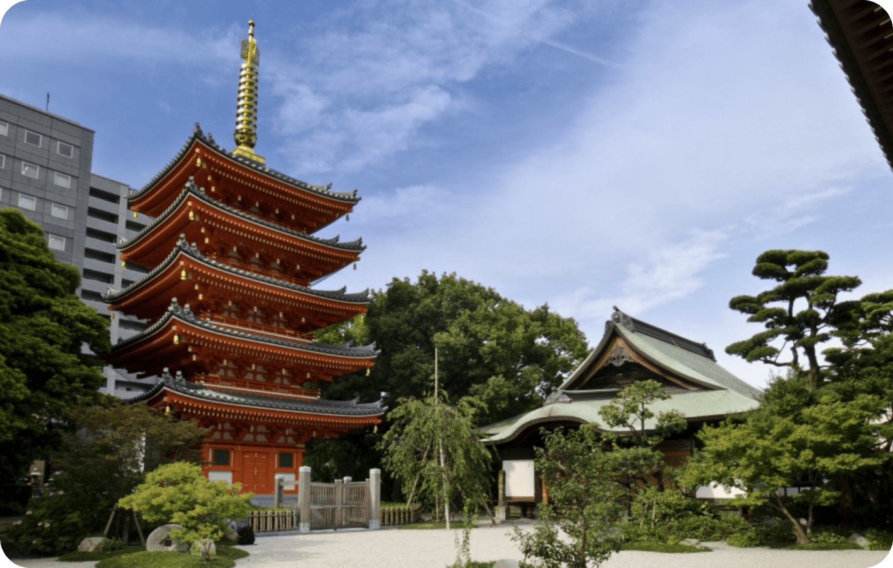 祭りと並んで旧市街といえば、やはり寺社が立ち並ぶその街並みです。旧市街の寺社はどれも中世の時代に創建された由緒あるものばかり。空海が創建した東長寺には、木造では日本最大級の福岡大仏が鎮座し、承天寺では座禅体験ができたり、秋には博多の寺社がキレイにライトアップされるイベントもあります。