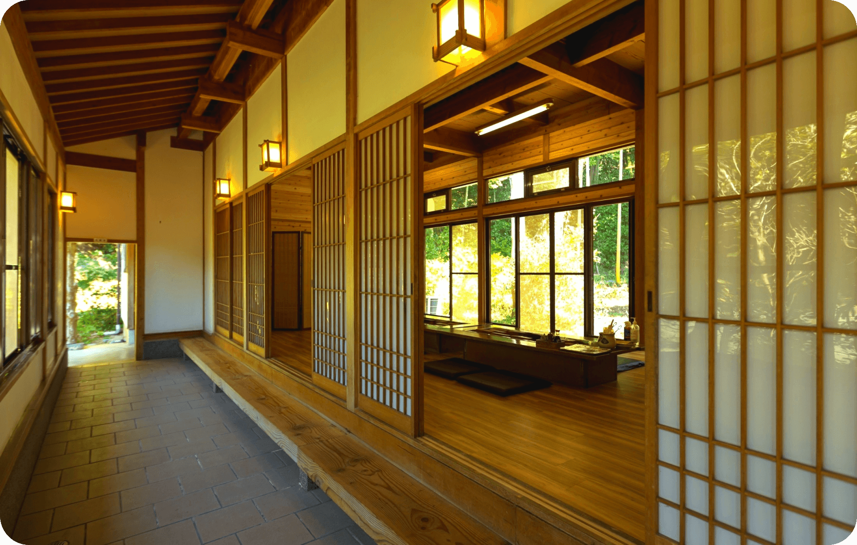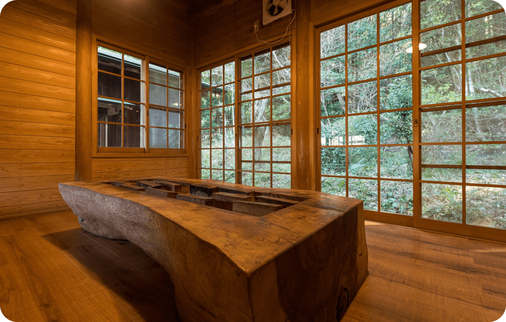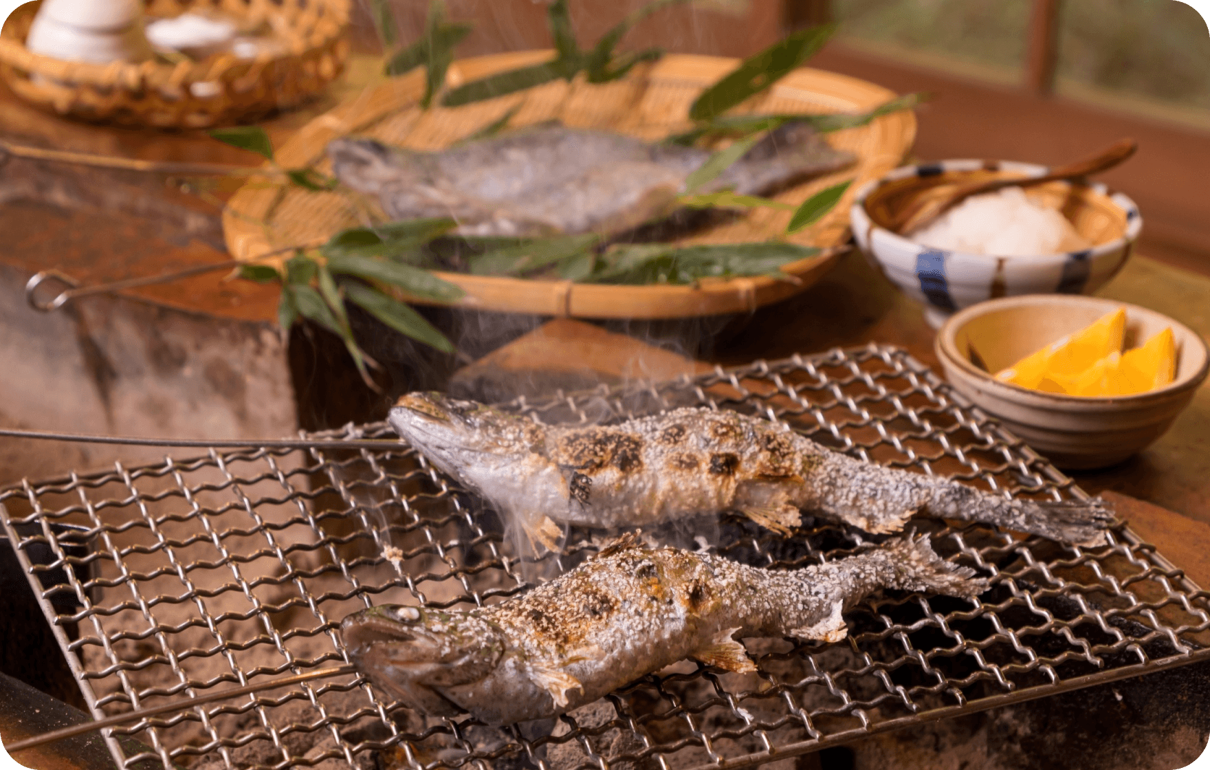 山のふもとにある自然に囲まれた、地元食材を楽しむことができる飲食店。離れ形式の個室であり、団体でのワーケーション時の利用にも最適。肉から魚、野菜まで、何を食べても美味しく、季節を感じられるのも良い。